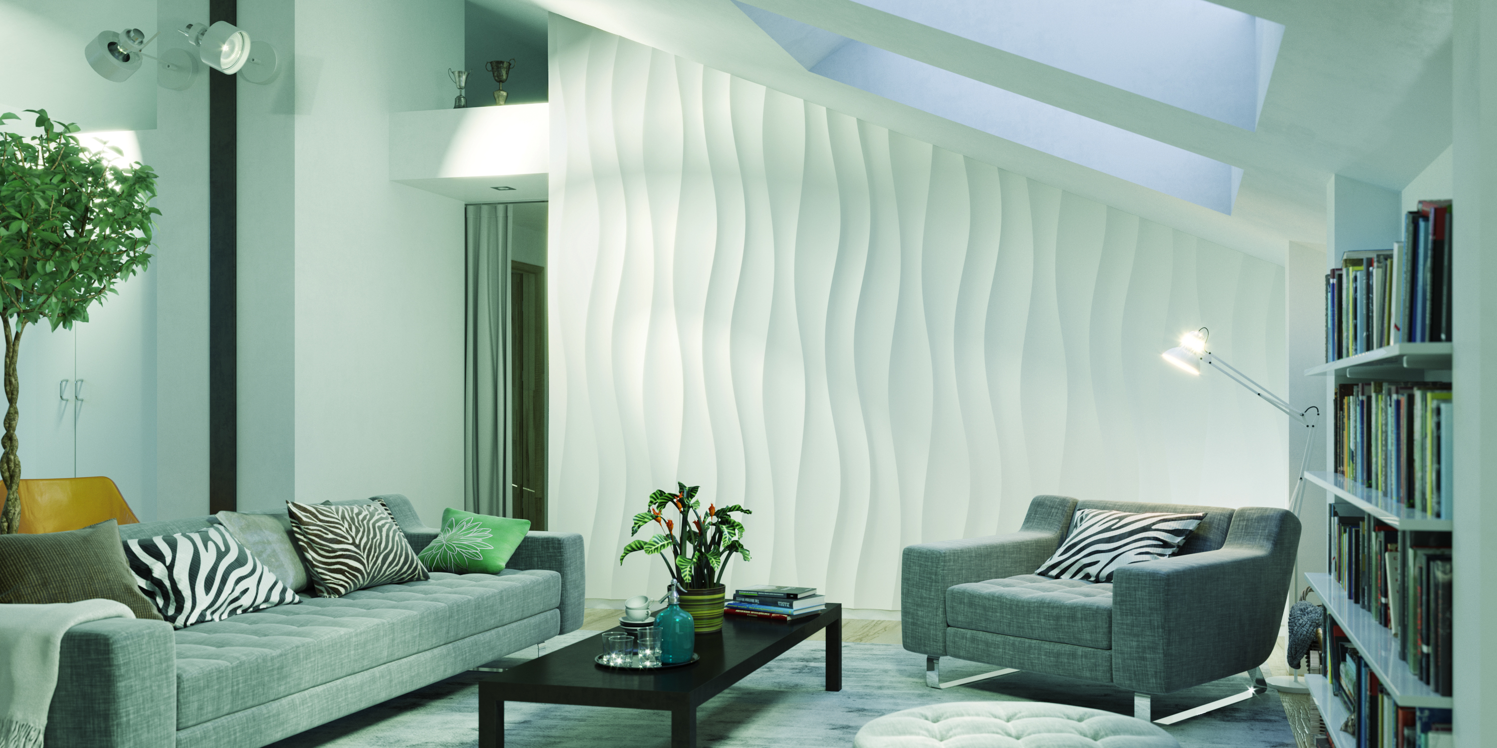 - Визуальное изменение помещения. Грамотно подобранные 3D-панели помогут визуально изменить геометрию комнаты, например с помощью вертикальных волнообразных узоров можно увеличить высоту потолков. С помощью панелей также удобно расставлять акценты на различных участках комнаты: изголовье кровати, кухонный фартук. Можно создать целую акцентную стену.