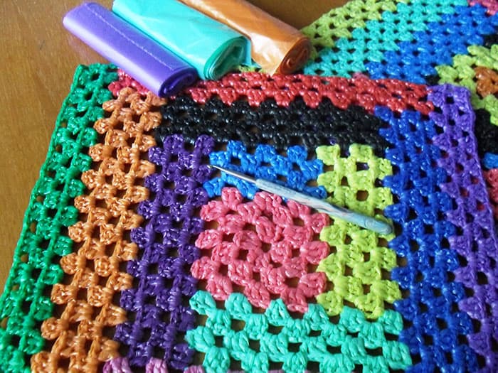 В интернете очень много идей, что можно связать из мусорных пакетов или полиэтиленовой пряжи: сумки, коробки, тапочки, мочалки, коврики и т.