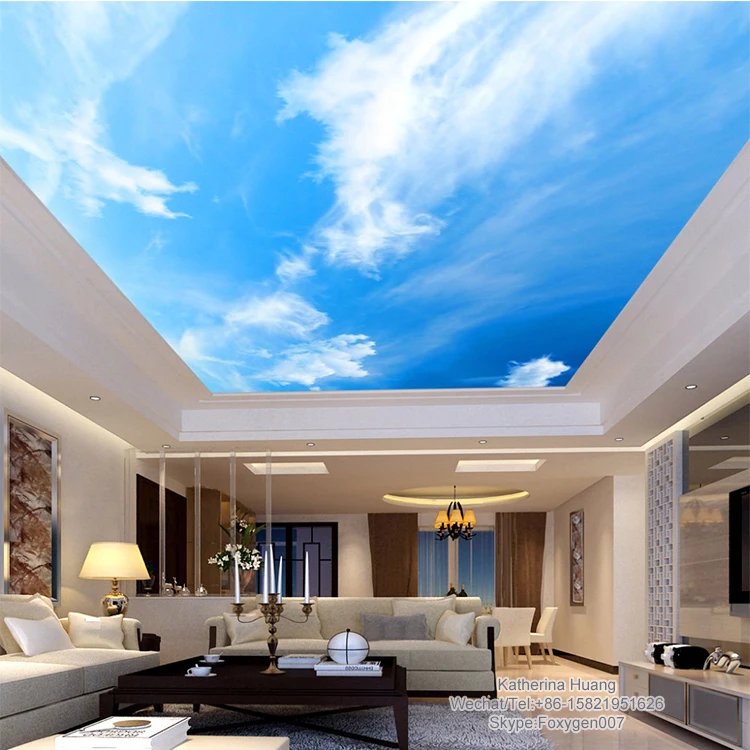 Натяжной потолок с фотопечатью в современной гостиной