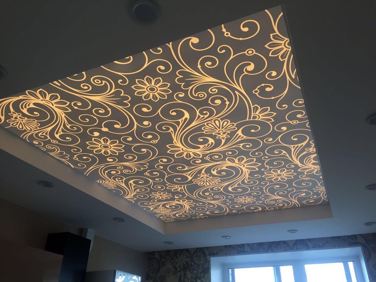 К примеру, изображения цветов или растительности на поверхности ситца будет выглядеть куда более живописно и реалистично на светящемся теплом фоне. Аналогичным методом из тоненьких пленок ПВХ создаются изображения объемного типа, к примеру, птиц или бабочек на потолочной поверхности.