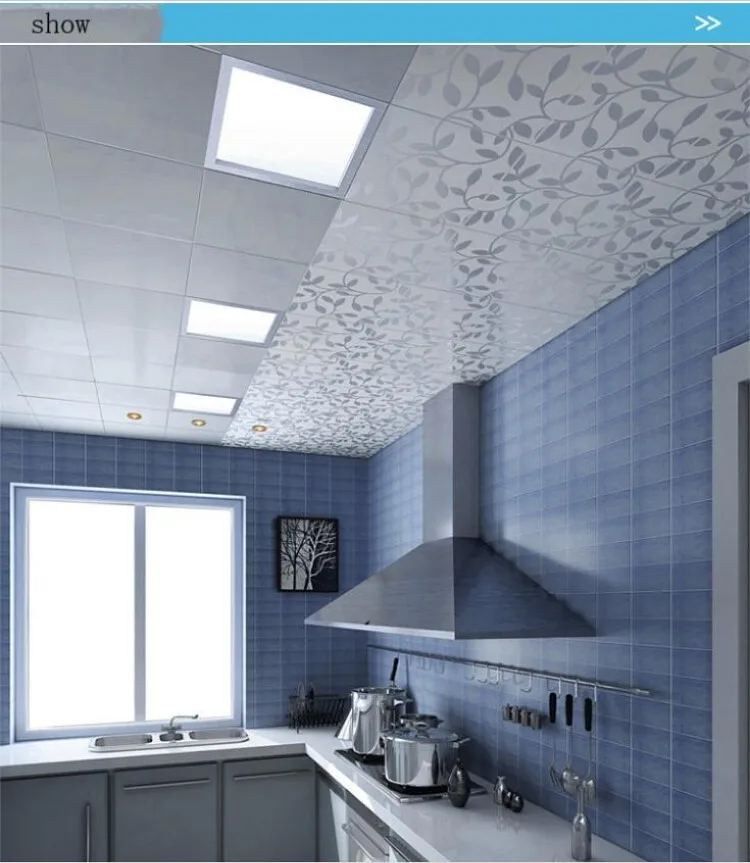 Сегодня для организации кухонного потолка выбирают яркие и насыщенные цвета, дополненные декоративными элементами. Создаются такие рисунки при помощи специальной термопленки или печатают узор машинкой. В итоге на плитах образуется имитация мрамора, дерева или просто красивые переплетенные линии.