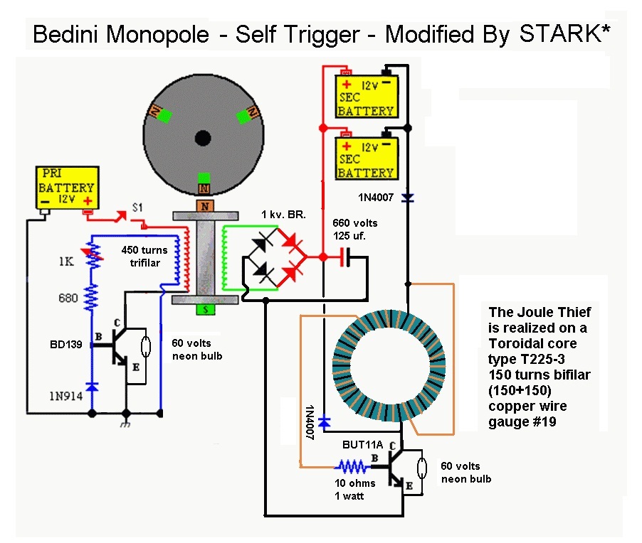 Магнитные генераторы концептуально ничем не отличаются от генераторов электроэнергии, устанавливаемых на электростанциях, т.к. схема предусматривает вращение постоянного магнита, которое вызывает возникновение индукционного тока в катушках статора. Разница только в способе вращения ротора. На АЭС и ТЭС вращение ротора осуществляется от турбины при помощи механической передачи, а ротор БТГ вращается или при помощи электродвигателя небольшой мощности, либо вращается под действием магнитных сил.