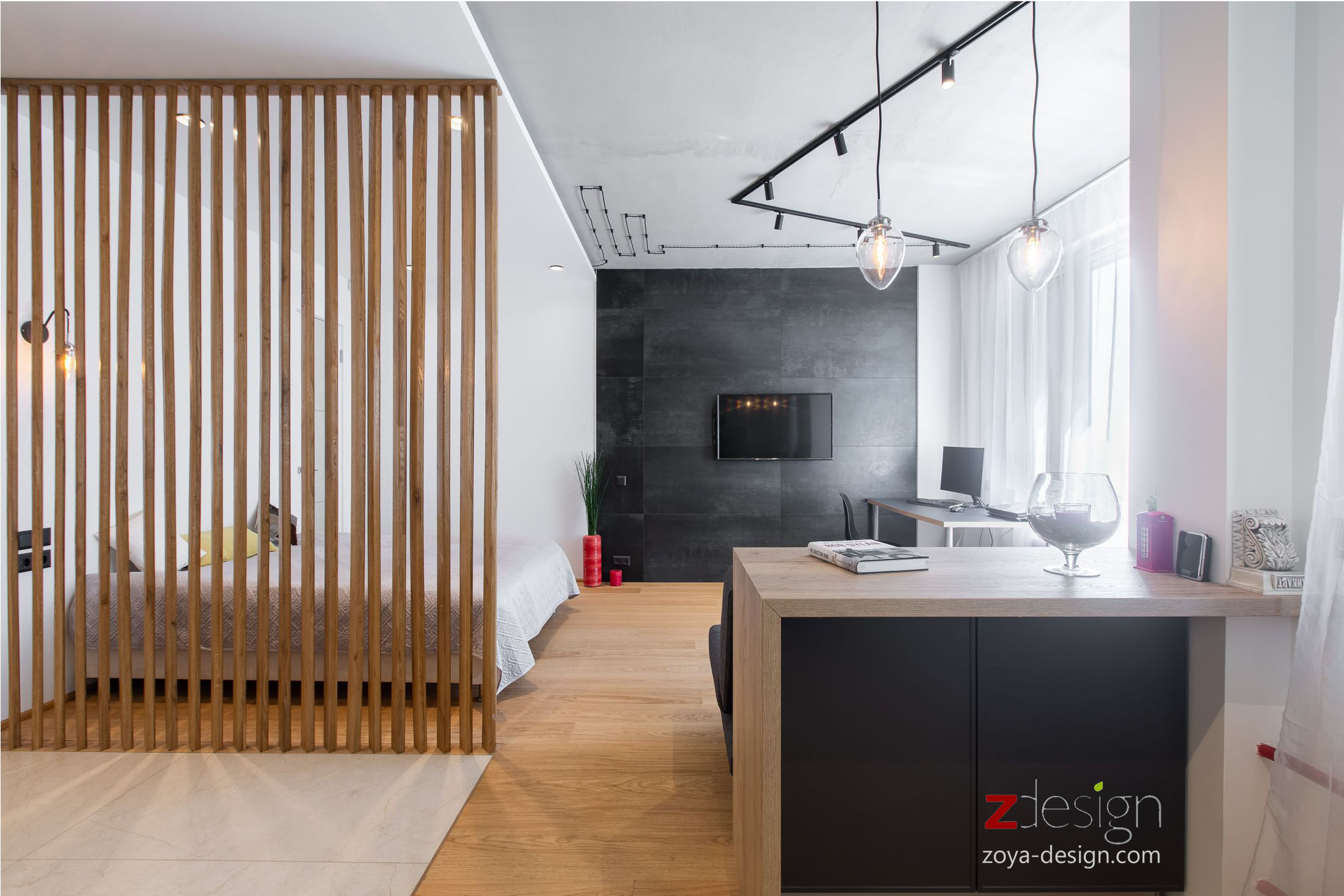 - Для зонирования маленьких квартир подойдут конструкции из деревянных реек. Они свободно пропускают свет и не дают ощущения замкнутости. Рейки могут располагаться в горизонтальном или вертикальном положении. Такие варианты хорошо смотрятся в гостиных. А для отделения рабочей зоны кухни лучше выбрать решетчатую переборку.