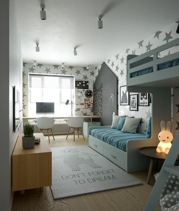 Также подумайте об уменьшении площади мебели, чтобы пространство казалось больше. Подвесные шкафы, узкие двухъярусные кровати и места для хранения, максимально использующие пространство на стене, помогут зрительно увеличить пространство на полу, поэтому и комната будет казаться больше.