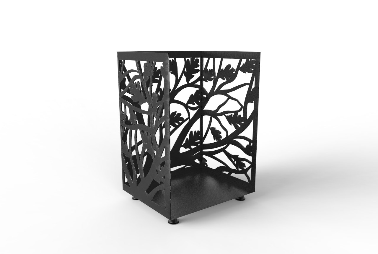 Можно встретить вертикальные конструкции, например, в виде цилиндра, изготовленного из стальных полос. Заменой ручкам служит авторский орнамент, кованый узор, за который также можно браться, чтобы перенести изделие. Но чаще используются как стационарные конструкции возле камина и печи. Кованая дровница для уличного хранения дров надежна, поскольку не подвержена воздействию перепадов температур, повышенной влажности и другим негативным факторам.
