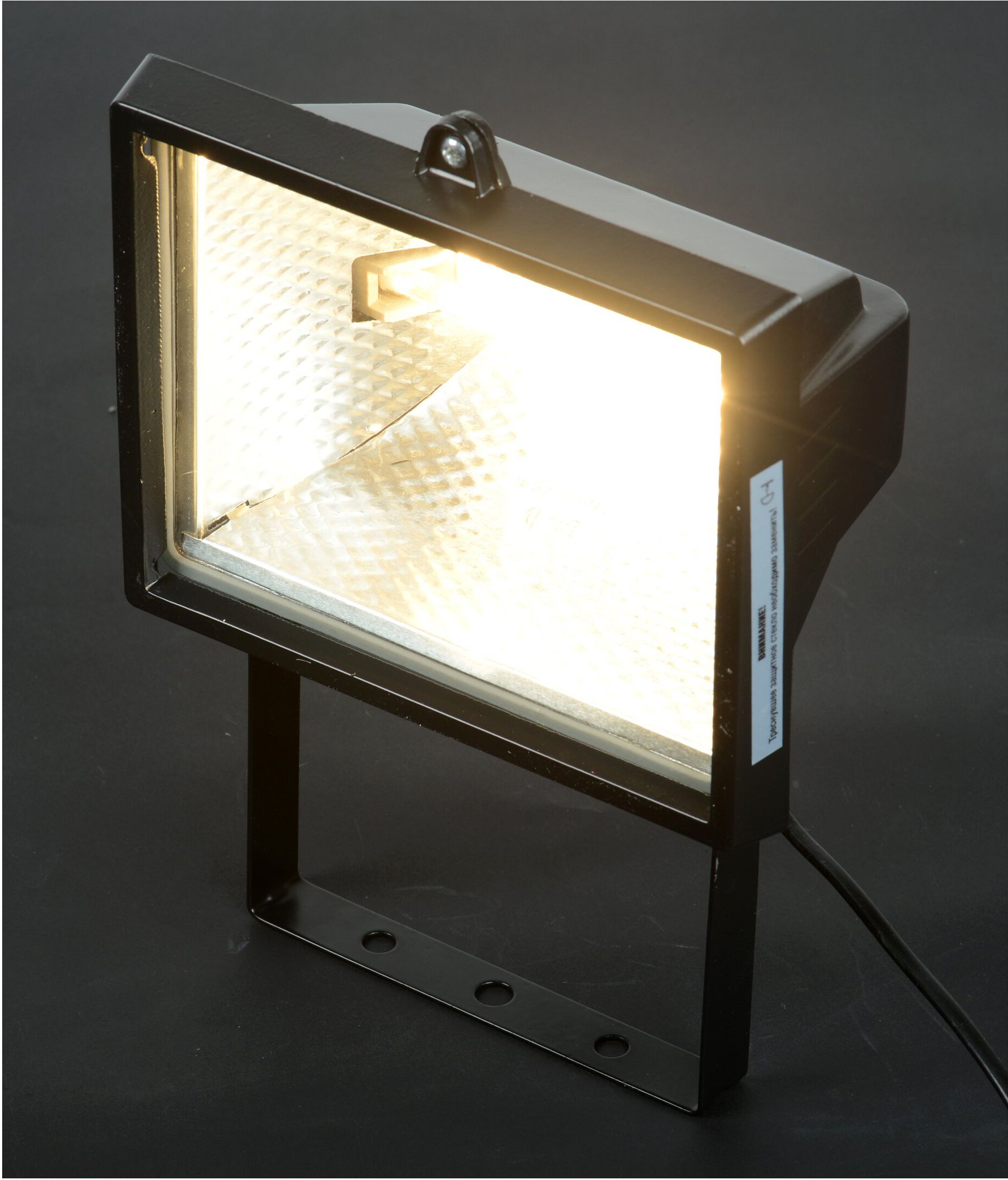 Галогенные прожекторы. Распространены и пользуются признанием у современного потребителя благодаря своей низкой стоимости. Имеют высокую светоотдачу, срок эксплуатации – до 4 тысяч часов. Ниже на фото – галогенный прожектор.