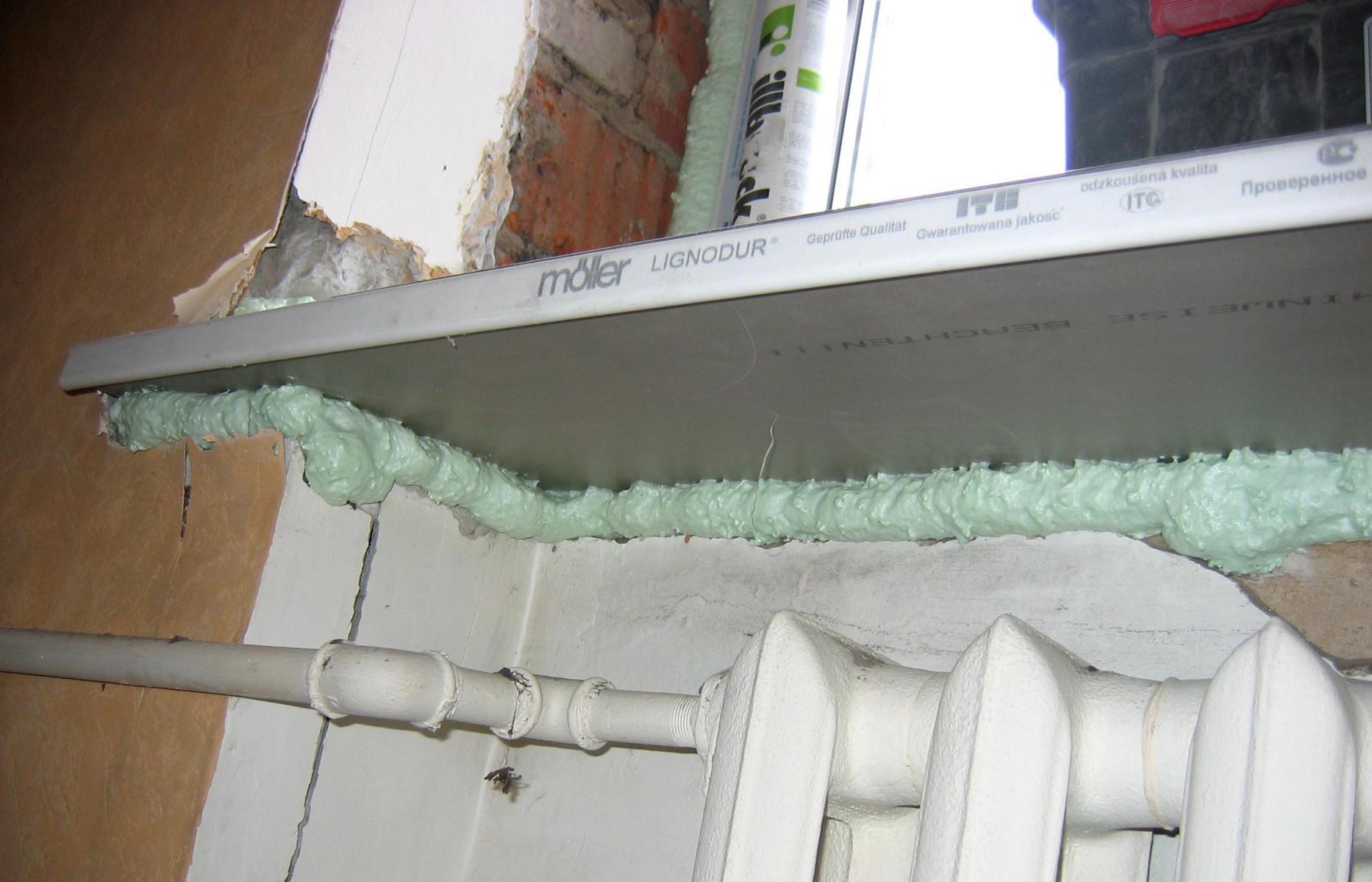 Примыкание к подоконнику нужно старательно подогнать, чтобы добиться минимальной щели. При подгонке используют шлифовальную бумагу, можно применить болгарку с отрезным кругом.