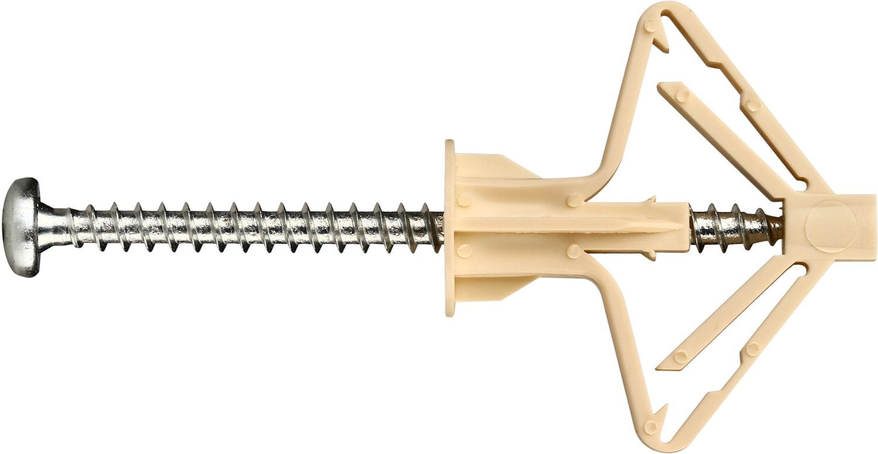 В типичном стиле анкеров для гипсокартона створки открываются зонтикообразным движением, когда вы закручиваете шуруп в стену. Таких клапанов четыре, и каждый слегка вмят в центре.