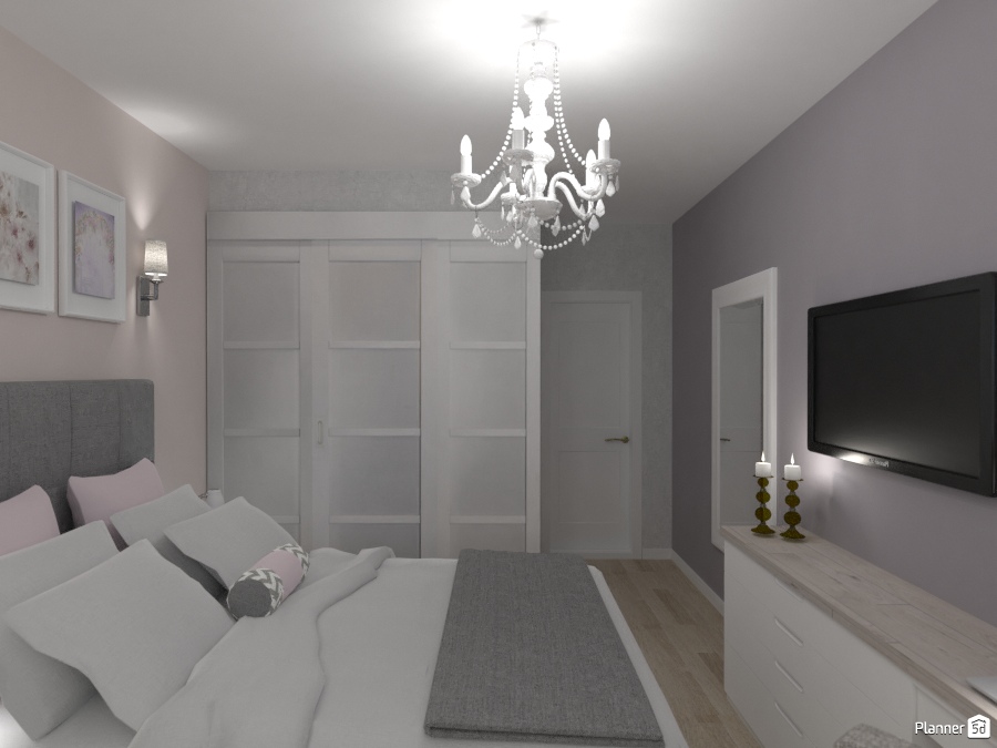 Все три помещения получились не очень большие, но достаточно комфортные – спальня 17 кв. м (плюс площадь присоединенного балкона), гардеробная – 6 кв. м и ванная комната – 4 кв. м. Правда, проход  в ванную комнату осуществляется через гардеробную, но это не критично, так как оба этих помещения – приватные и используются исключительно хозяевами. В итоге, из одного большого помещения мы получили три функциональных пространства – идеальное решение!