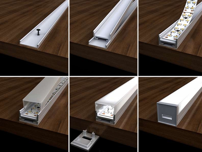 Использование профиля позволяет сделать свет равномернее и упрощает монтаж.Обычно на ленте есть клеевой слой с обратной стороны, надо снять защитную пленку и плотно прижать элемент к поверхности. Также стоит найти место для блока питания, чтобы он не был заметен, но при этом нормально охлаждался.