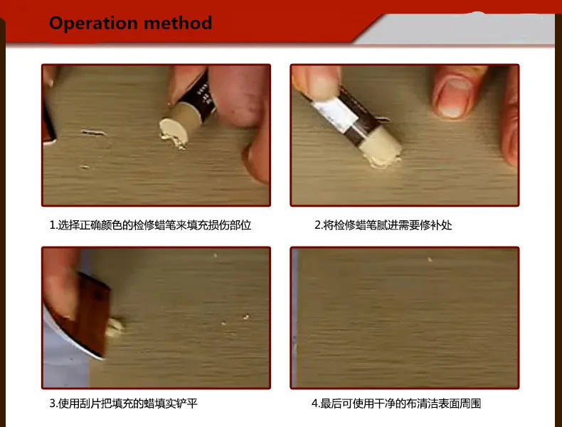 Если царапина небольшая, то для ее устранения достаточно провести по проблемной зоне один раз. В случае более глубоких поражений древесного полотна следует заполнять царапину до полного его устранения. После этого нужно выждать время до полного высыхания воска. Затем рекомендуется с помощью небольшого куска ветоши тщательно отполировать поверхность проблемной зоны. Это гарантирует устранение царапин, а также воссоздание естественного цвета воском.