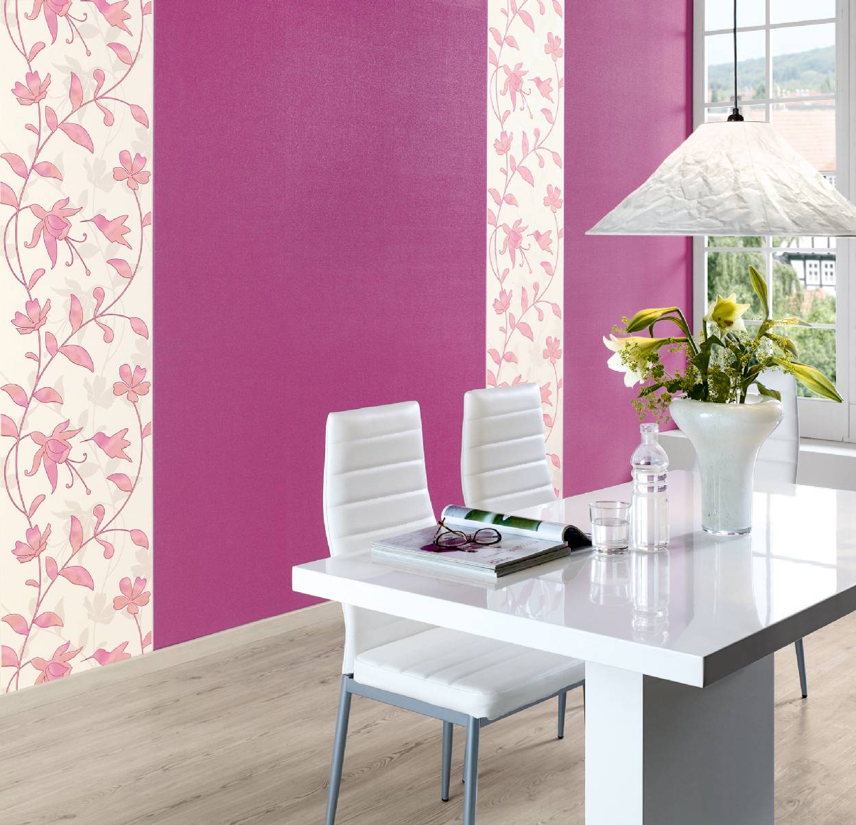 Чтобы добиться модного эффекта в декорировании стен, иногда достаточно обоями разделить вертикально разные функциональные зоны комнаты.